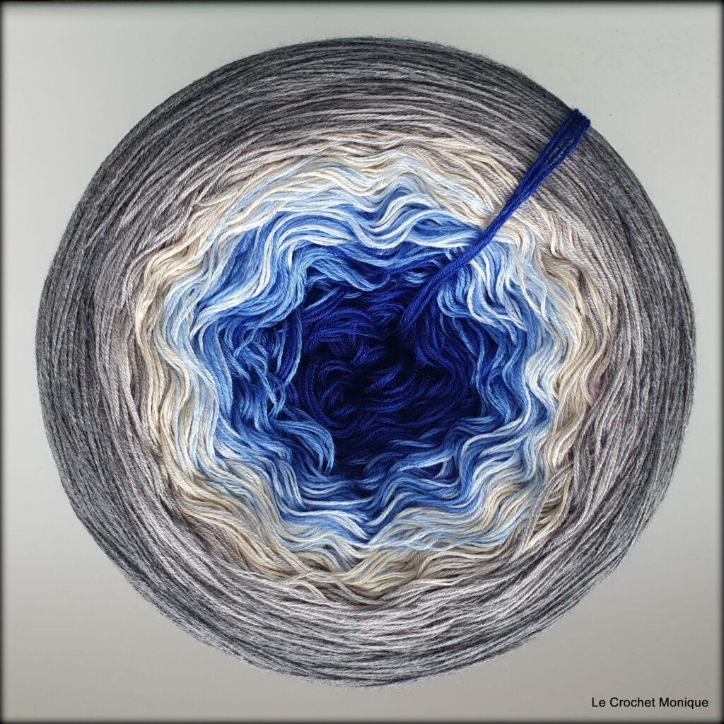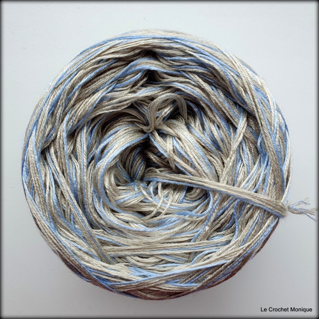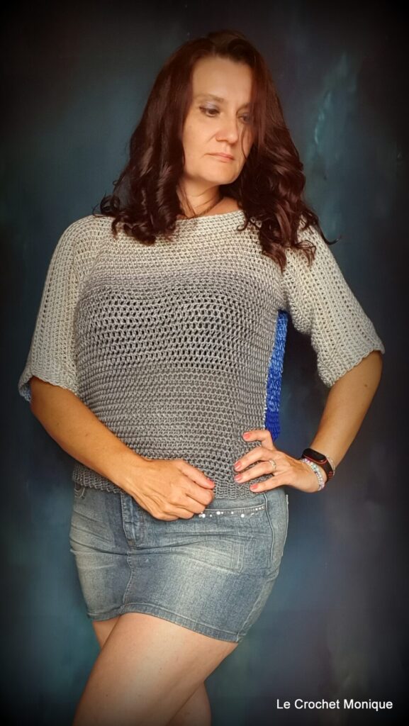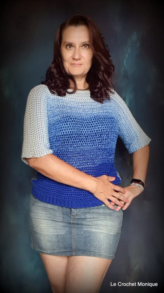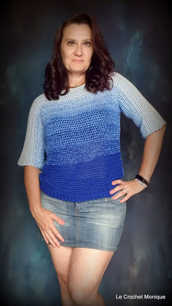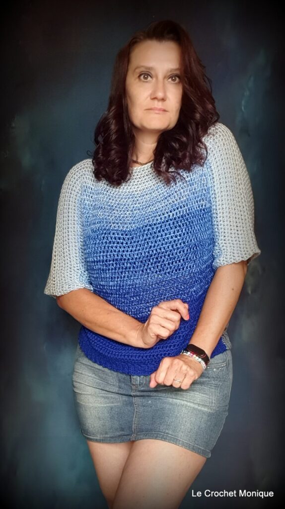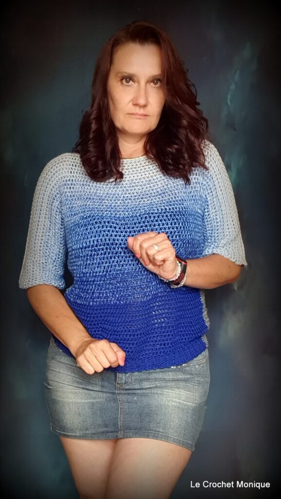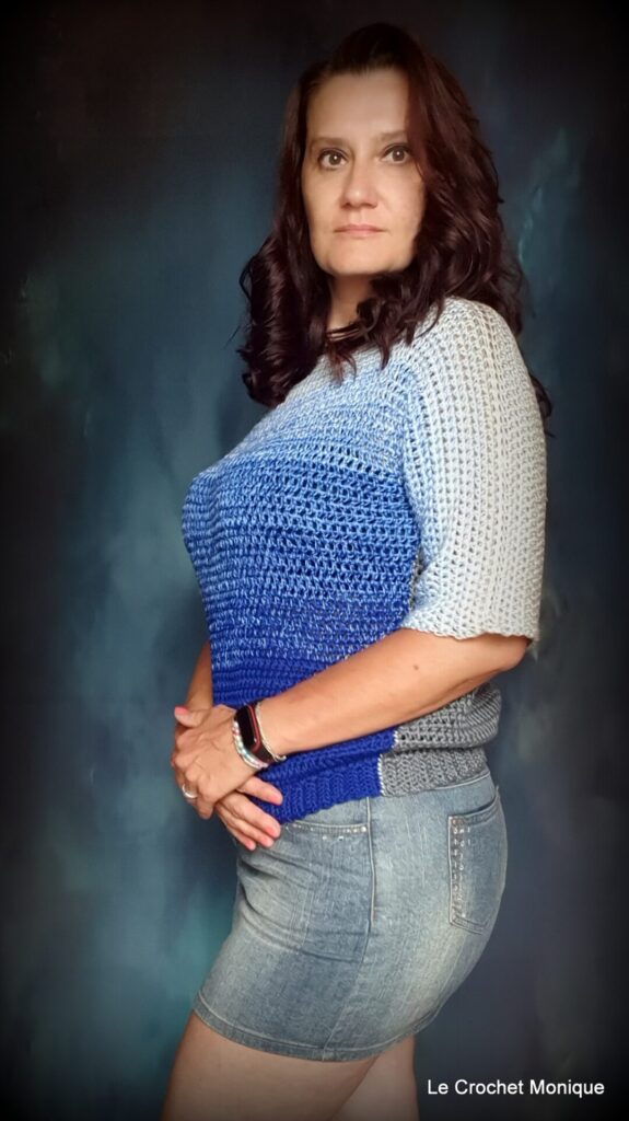 Na háčkovanie trička Reversa som použila priadzu Mystique – moju vlastnú priadzu Le Crochet Monique, konkrétne 4-nitku s návinom 800 metrov a hmotnosťou približne 400 g. Ide o 100 % mercerizovanú bavlnu, ktorá sa krásne leskne, je pevná, odolná a zároveň príjemná na pokožku – ideálna na letné oblečenie. Aby bol farebný prechod plynulejší a priadze dostatok, pridala som doplnkovú priadzu Harmonique petite – 3-nitku rovnakej kvality s návinom 200 metrov a hmotnosťou približne 100 g. Spojenie týchto dvoch priadzí vytvorilo jemný farebný gradient a zároveň zachovalo všetky výhody kvalitnej bavlny.