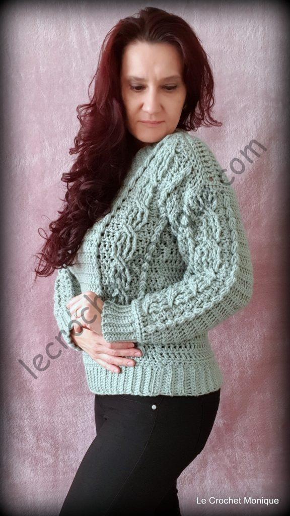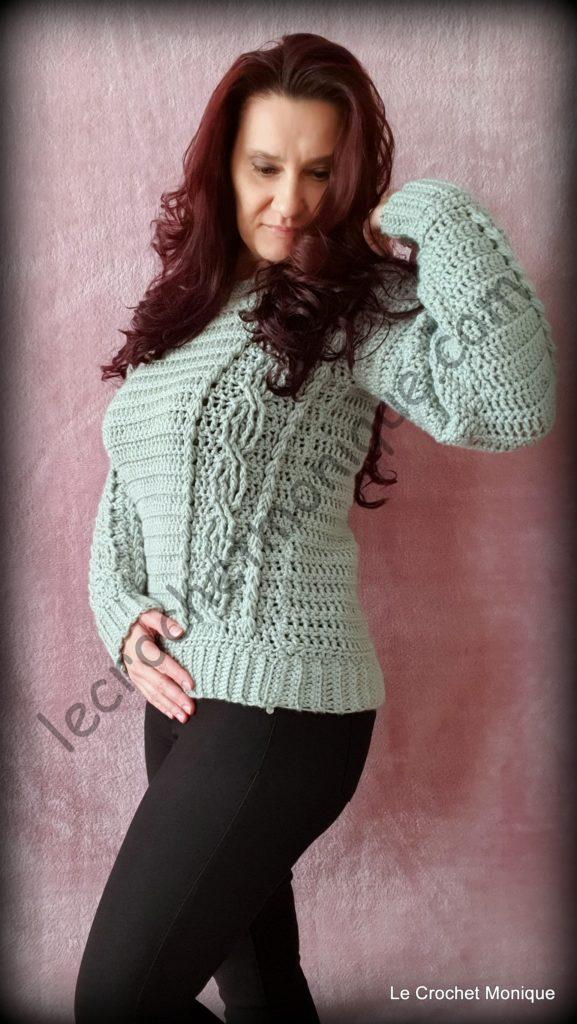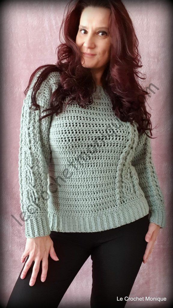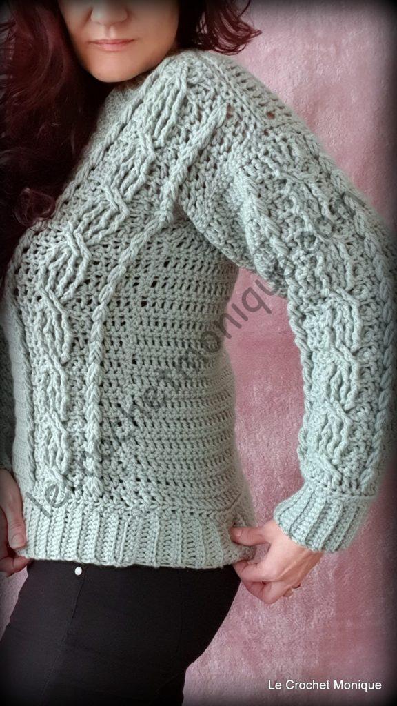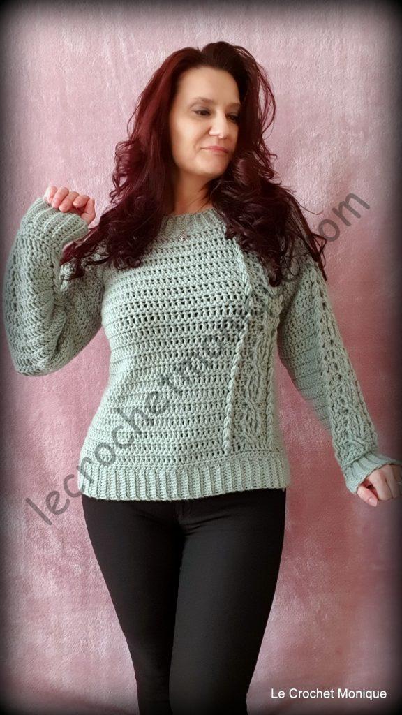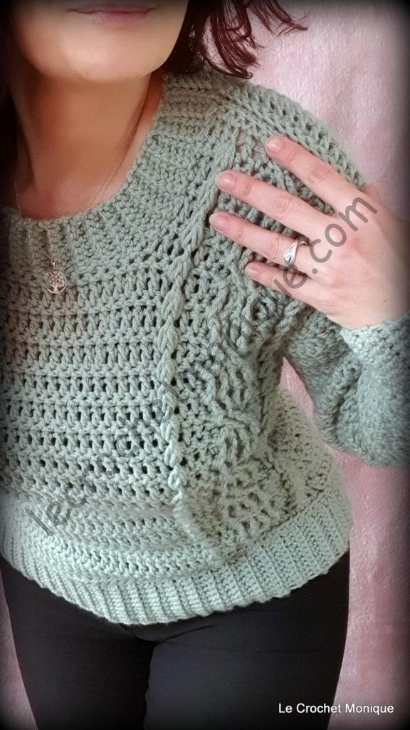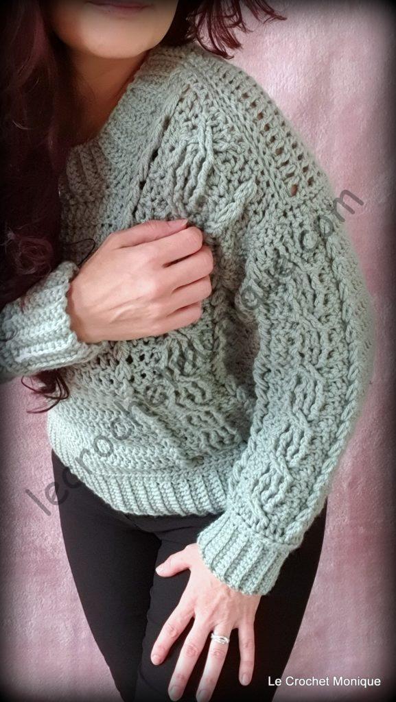 Pulóver sa skladá zo štyroch dielov. Najskôr si uháčkujeme zadný diel. Zadný diel je pomerne jednoduchý. Začíname patentom a potom háčkujeme vzor, kde sa striedajú len dva riadky. Potom si uháčkujeme predný diel. Na prednom diely budeme po ľavej strane vypletať tzv. osmičkový vzor a slzičky. Potom si uháčkujeme rukávy, ktoré tiež začíname patentom a stredom si budeme háčkovať osmičkový vzor so slzičkami. Následne si pulóver zošijeme, a obháčkujeme výstrih.