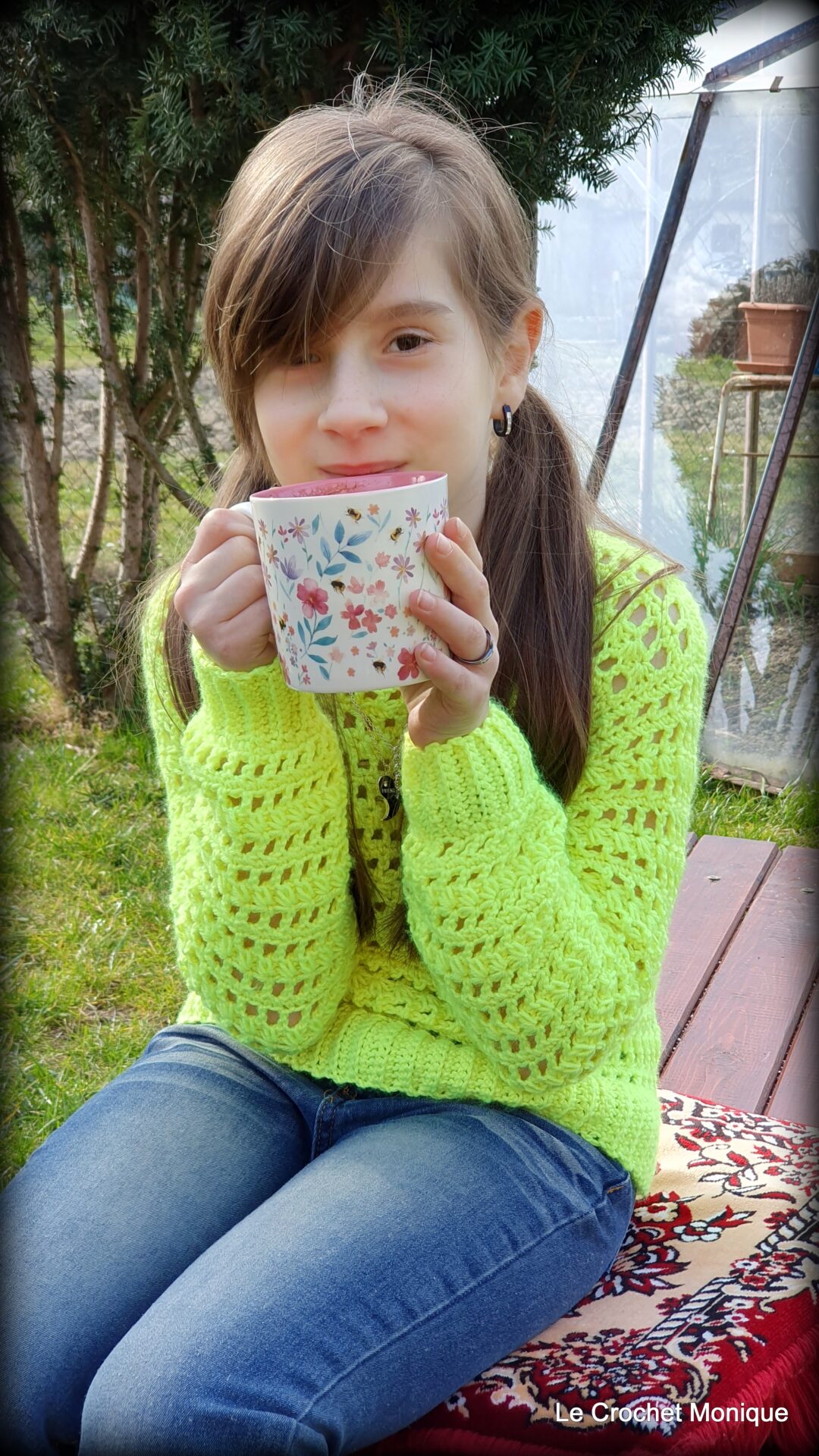 Je fascinujúce, ako farba a vzor dokážu zmeniť náladu celého kúska. Pri výbere farby sme spolu prešli niekoľko možností – od jemných pastelových tónov po výraznejšie kombinácie, a nakoniec sme sa rozhodli pre tú, ktorá najlepšie vystihuje jej štýl. A hoci som pri fotení musela čeliť obvyklému „nespolupracovaniu modelky“ – každý rodič háčkovacieho projektu vie, že toto je najťažšia časť – výsledok stál za to. Pulóvrik sa jej páči, cíti sa v ňom pohodlne a veľmi rada ho nosí.